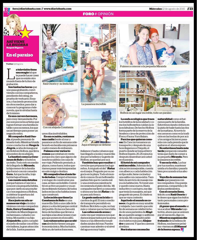 Es común ver artistas y amigos de RULO pasando unos días de descanso en LA CONSTANZA DE RULO. Como su comadre Raquel Bigorra que es una amante más de Holbox, aquí con el popular Ñañas que tiene un restaurante delicioso en la zona de la playa pregunte por su ceviche de Corvina y su pescado empanizado. Además puedes leer por ti mismo el paraíso del que te estás perdiendo en la columna de Raquel Bigorra "AHÍ VIENE LA BIGORRA".