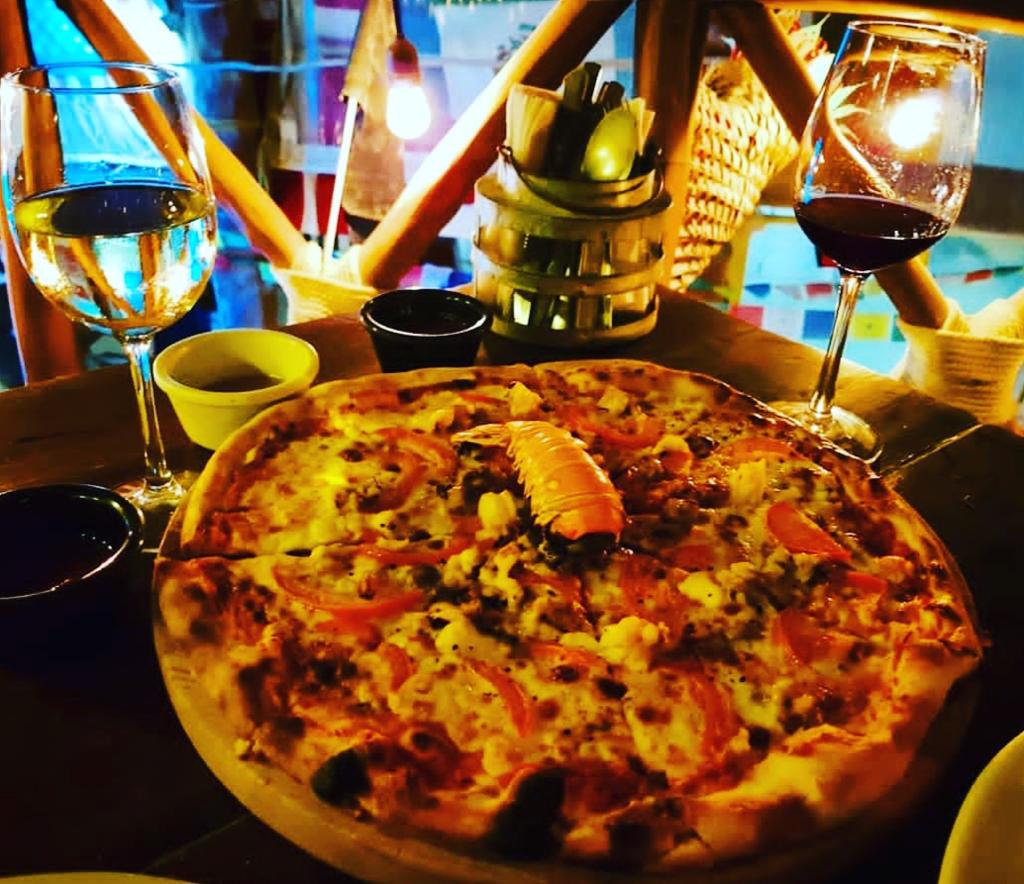La mejor pizza de langosta de la isla, si cenas con nosotros por ser huesped, te obsequiamos 2 copas de vino de la casa.